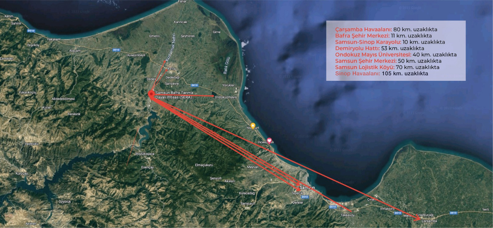 Samsun Çarşamba havaalanı Bafra Sera OSB’ye 80 km. uzaklığında olup genel olarak yoğun şekilde Çarşamba havaalanı kullanılmaktadır. Yine Sinop havaalanı Bafra Sera OSB’ye 114 km. uzaklığındadır.